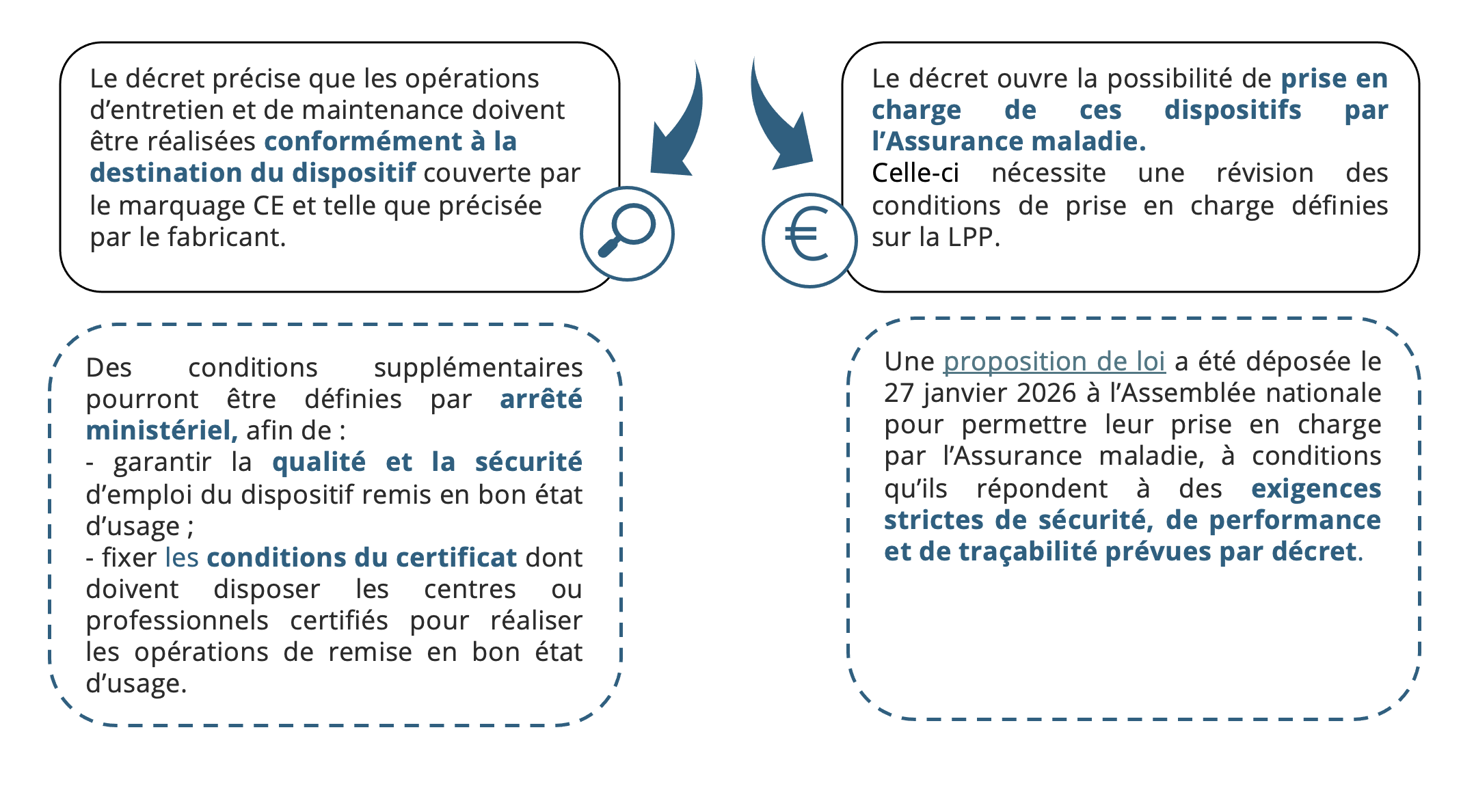 - Un arrêté doit fixer la liste des DM pouvant faire l’objet d’une remise en bon état d’usage.Deux questions écrites ont été soumises en janvier afin de demander la date de parution de cet arrêté . Elles soulignent l’absence d’obstacle juridique à sa publication, le projet de texte ayant fait l’objet d’une procédure de notification à la Commission européenne et n’ayant reçu aucune opposition.